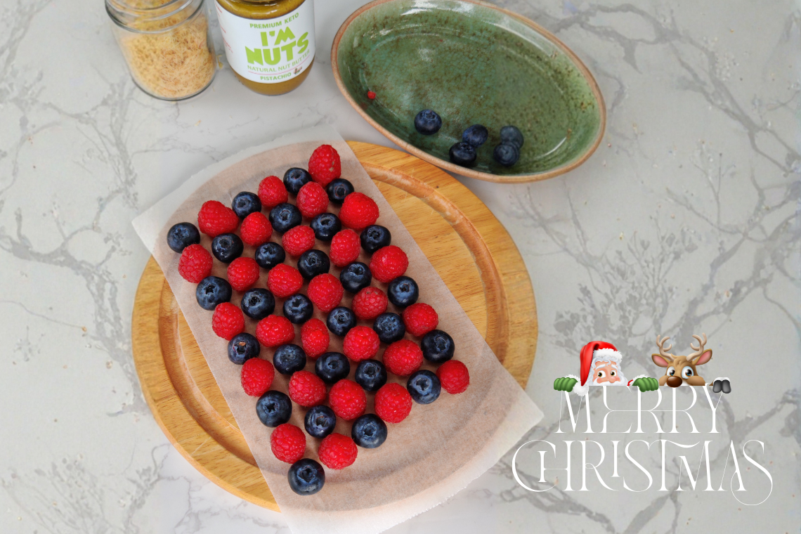 เอาบลูเบอร์รี่ มาเรียงชิดๆ กัน และละลายดาร์คชอคโกแลตมาราดบลูเบอร์รี่ให้ติดกัน